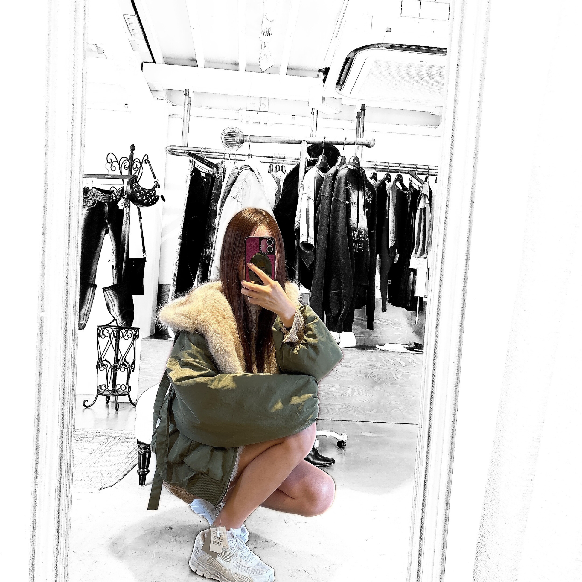 MITSUKI Reversible Fur Hoodie Jacket - Khaki / Beige Fur